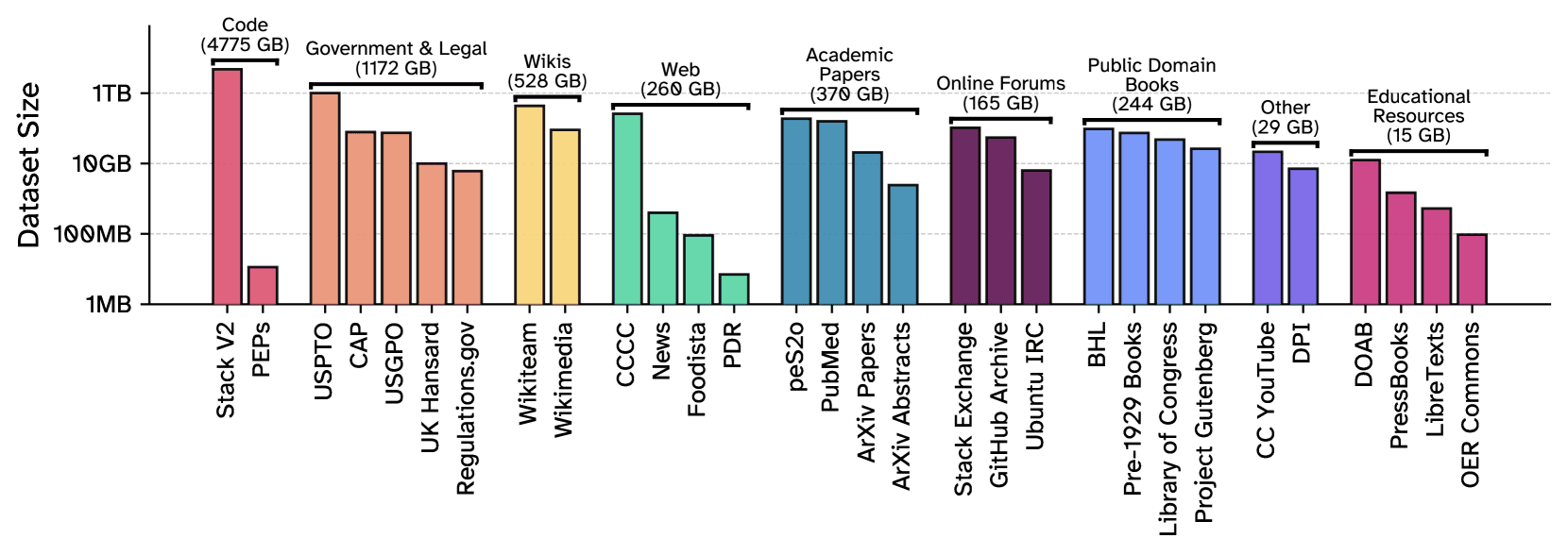 論文に掲載された上図は、その構成の一部を示している。最も大きな割合を占めるのは、オープンソースソフトウェアのソースコード(4.7TB超)であり、次いで政府・法律関連文書(1.1TB超)、学術論文、オンラインフォーラム、パブリックドメインの書籍などが続く。