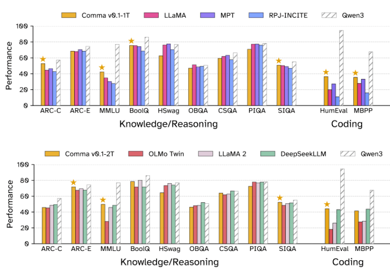 どれほどデータセットが「クリーン」であっても、それで学習したAIの性能が低ければ意味がない。プロジェクトチームは、Common Pileの真価を証明するため、70億パラメータを持つ2つの言語モデル「Comma v0.1-1T」(1兆トークンで学習)と「Comma v0.1-2T」(2兆トークンで学習)を開発し、その性能を評価した。