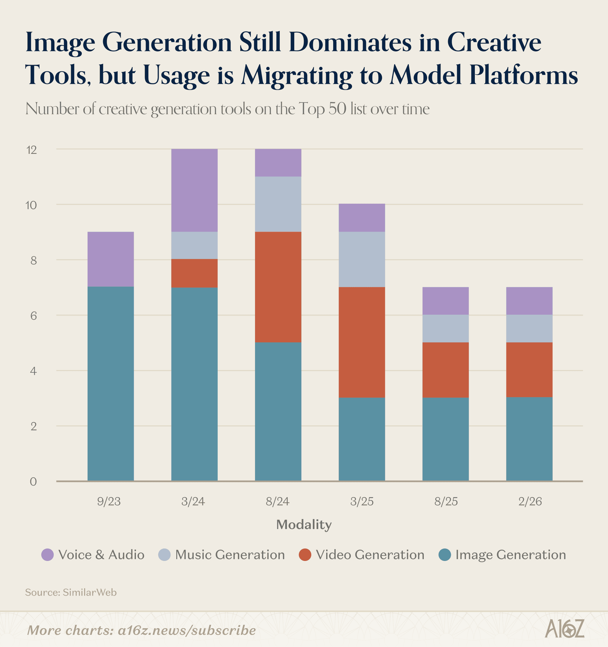象徴的なのがクリエイティブ系の構成変化である。a16zによれば、2023年9月の初版ではWebクリエイティブツール9製品のうち7製品が画像生成だった。第6版では画像生成は3製品に減り、空いた場所を動画、音楽、音声が埋めている。