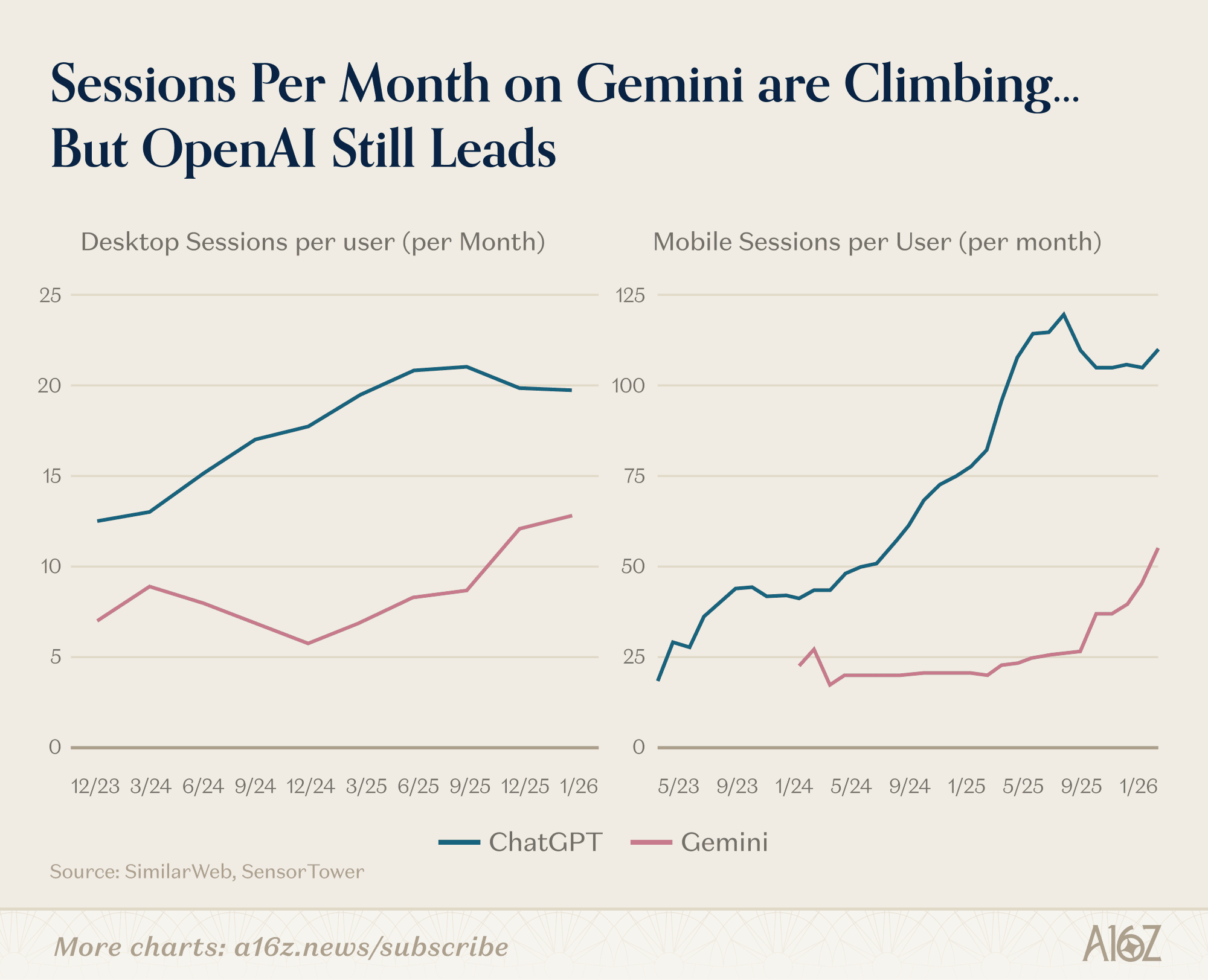 ここで見落とせないのは、競争の単位がモデルの出来不出来から利用文脈の蓄積へ移っている点である。a16zは、利用履歴や好み、接続先サービスを多く持つほど応答の質が上がり、その質の向上が再利用を呼び込む循環に触れている。Webでの月間セッション数はGeminiが伸びているものの、依然としてChatGPTが上回る。モバイルでは差がさらに大きい。利用回数の差は、単発の検索需要では説明しにくい。個人の情報、日々の行動、外部サービスとの接続が一つのプロダクトに集まるほど、乗り換えコストが高まる構造が見えてくる。