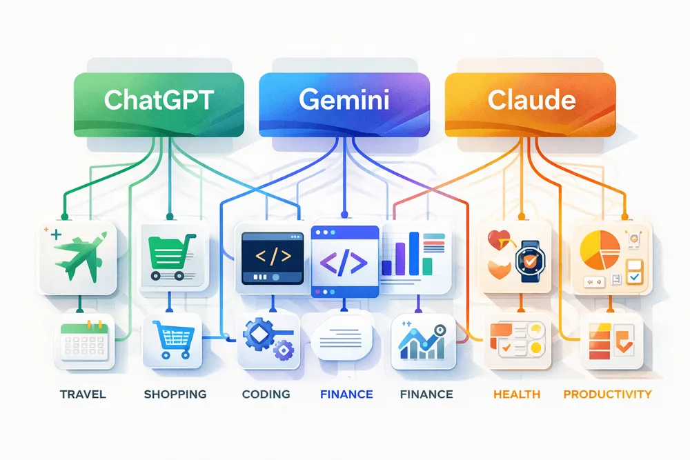 分岐が本格化するのはその先である。ChatGPT側には旅行、買い物、食品、健康、ライフスタイル、エンターテインメントといった消費者接点のカテゴリが厚く並ぶ。Expedia、Instacart、Zillow、MyFitnessPalのような接続先は、検索や要約のためというより、予約、購買、比較、記録といった日常行動そのものをAIの窓口へ引き寄せる。OpenAIが目指しているのは、検索エンジンの代替というより、消費者向けの入口を再設計することだと読める。