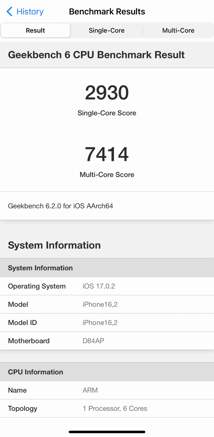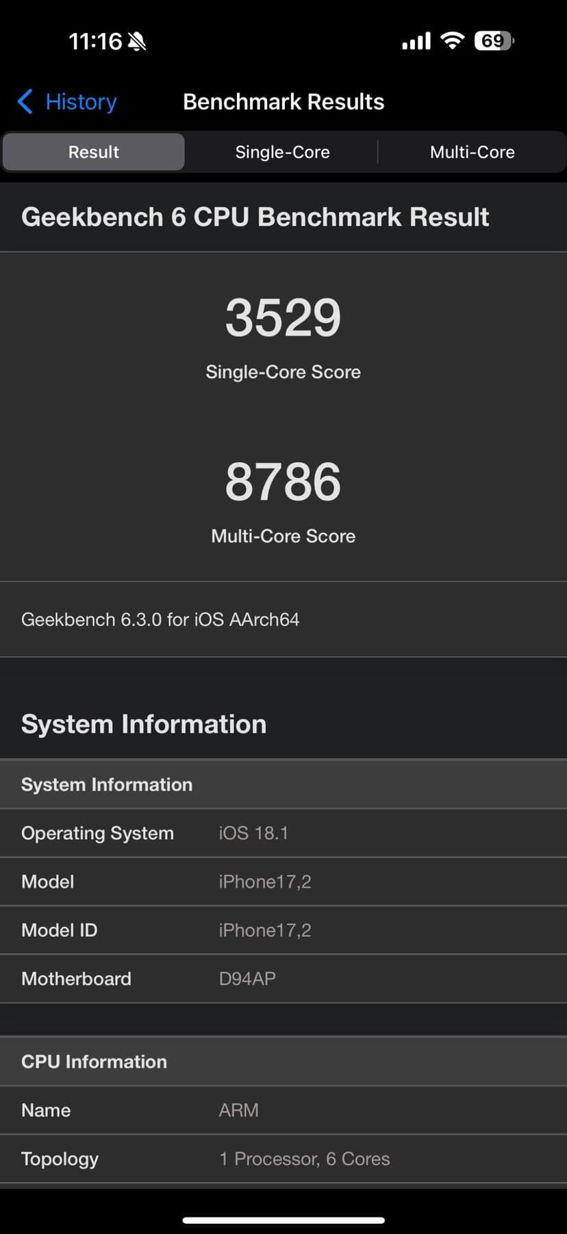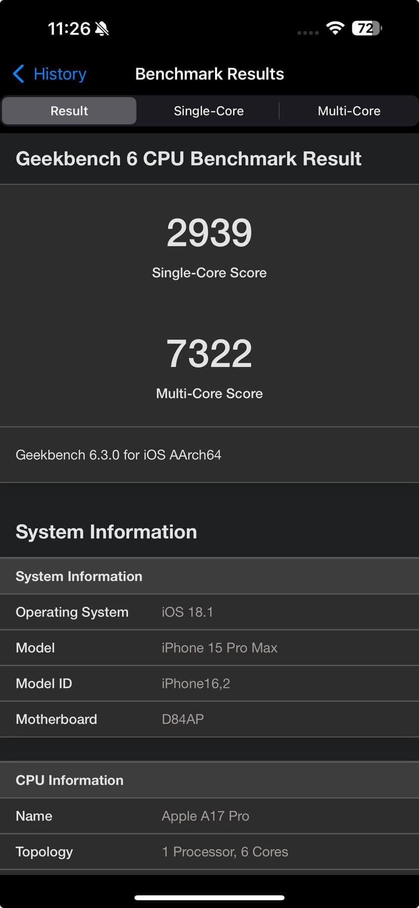 実際に筆者も確認してみたところ、iPhone 16 Pro Maxにおいて、iOS 18.1パブリックベータ1とパブリックベータ2ではGeekbench 6のスコアに差が生じていることが確認出来た。シングルコアでは6%前後、マルチコアでは8%前後のスコアアップだ。