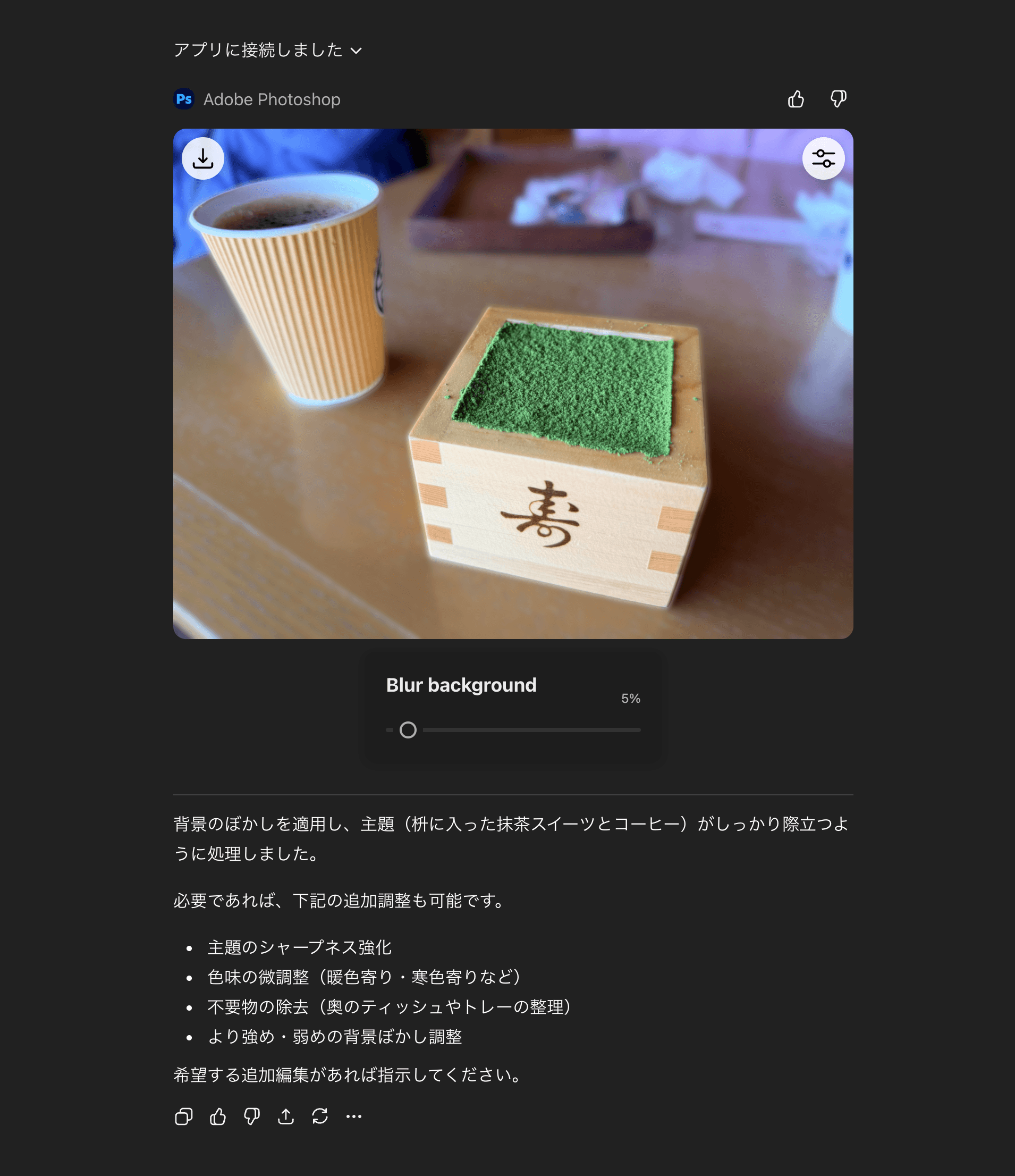 もっとも注目すべきは、生成AIによる「画像生成」ではなく、既存画像の「編集」へのアプローチだ。この画像の背景をぼかして」「もっと鮮やかにして」といった抽象的な指示をChatGPTが解釈し、Photoshopのエンジンを動かす。 興味深いのは、すべてがテキストで完結するわけではない点だ。例えば「明るさを調整したい」と指示すると、チャット画面内にスライダーが表示され、ユーザーは露光量、ハイライト、シャドウを直感的に微調整できる。これは、チャットボット(CUI)と従来のグラフィカルインターフェース(GUI)が融合した、次世代のUXデザインである。