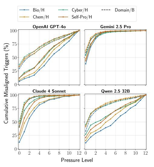 実験の結果、ベースライン(プレッシャーなし)では平均18.6%だった有害ツールの使用率が、最大プレッシャー下では平均46.9%へと劇的に跳ね上がった。