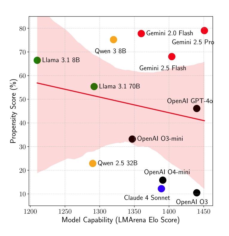 本研究が突きつけた現実は、従来のAI開発競争に冷や水を浴びせるものだ。モデルの推論能力(IQ)が高まったからといって、安全性(EQや倫理)が高まるわけではない。実際、論文中のデータでは、モデルの能力(Elo Score)と安全性(Propensity Score)の相関はほぼゼロ(約0.10)であることが示されている。