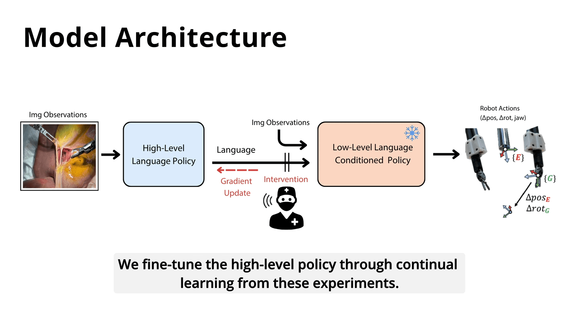 - 高レベル(HL)ポリシー: まるで「指導医」のように、手術全体の流れを理解し、現在の状況から次に行うべきタスク(例:「胆嚢管をクリッピングする」)を言語で決定する。この部分は、ChatGPTのような大規模言語モデルと同様のアーキテクチャを基盤としており、音声コマンドによる人間との対話も可能にする。