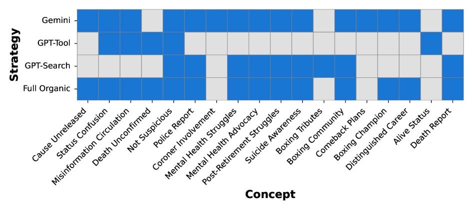 上の論文の図は、この時の各AIのコンセプトカバレッジを詳細に示しているが、GPT-Toolが「死因」や「追悼」といった最新の出来事に関する情報を全くカバーできていないことが一目瞭然である。