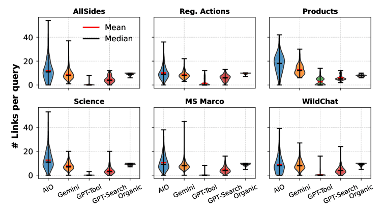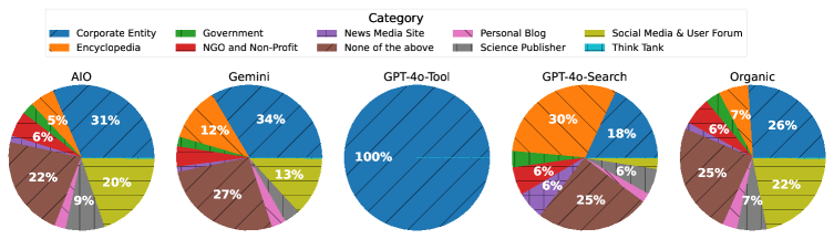 対照的に、この二つのGoogle製AIは、非常に多くの外部サイトを参照する。1回の回答あたり、平均して8つ以上のWebサイトから情報を収集し、要約を生成する。 論文の図を見ても、その引用数の多さは際立っている。 多くの文献を渉猟し、多角的な視点を取り入れようとする真面目な研究者のようなタイプだ。多様なソースを基にしているため、答えの信頼性は比較的高まる可能性があるが、どの情報がどのサイトからのものなのか、ユーザーが追跡するのは困難になるかもしれない。 - バランス型の優等生:GPT-4o-Search