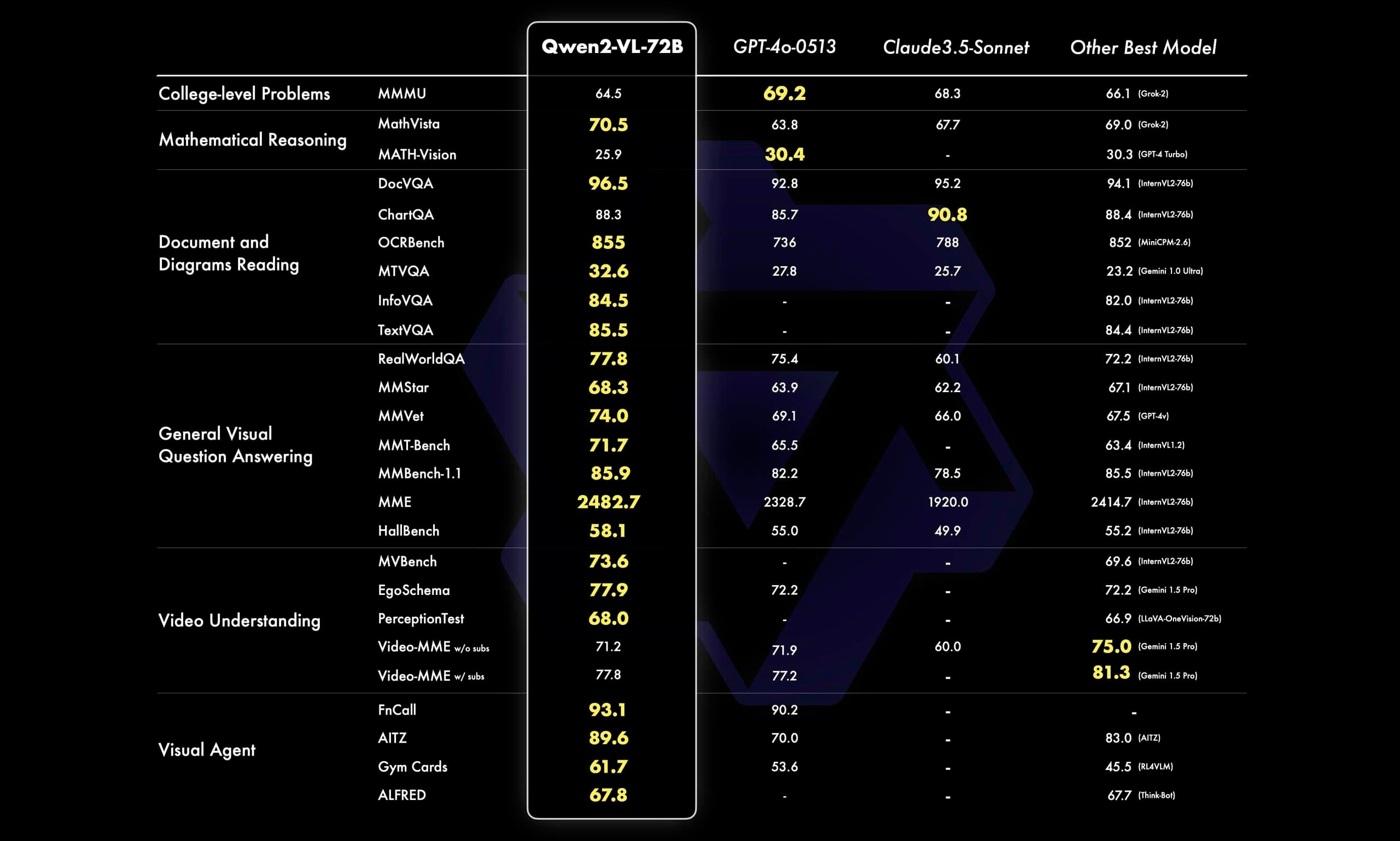 ベンチマークテストにおいて、Qwen2-VL-72BモデルはMathVista、DocVQA、RealWorldQA、MTVQAなど、複数の視覚理解ベンチマークで最先端の性能を達成した。特筆すべきは、このモデルがOpenAIのGPT-4o-0513やClaude 3.5 Sonnetを多くのベンチマークで上回ったことである。