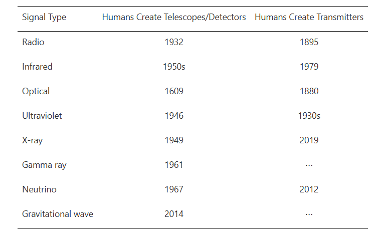 過去からの発見は、1〜2世代経過すると素朴なものに思えることがある。これは、SETI(地球外知的生命探査)を生み出した過去の発見についても当てはまる。人類は、私たちが無秩序に電波信号を宇宙に向けて発信しているのなら、他の地球外知的生命体(ETI)も、もし存在するならば、おそらく同じことをしているのだろうと気づいた。