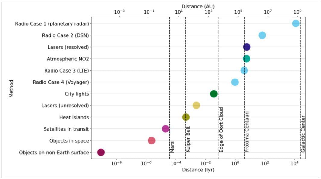 これは単純な問いに帰着する:私たちの現在の技術を持つETIは、私たちのテクノシグネチャーを検出できるのか?もし答えがイエスなら、彼らは私たちのどのシグネチャーを、どれほど遠くから検出できるのか?