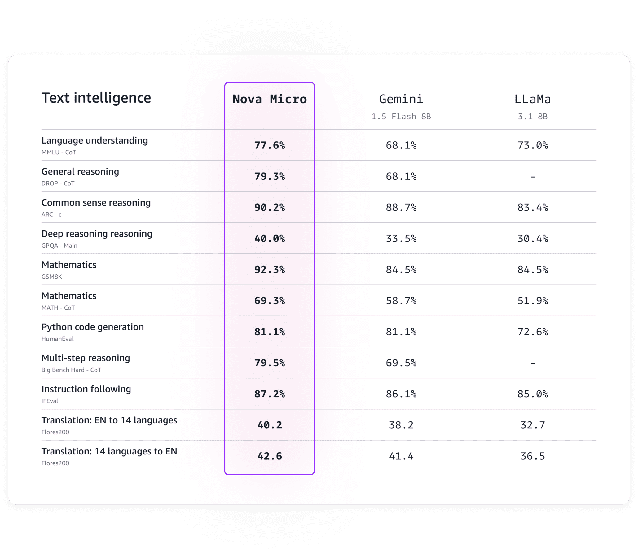 Microは性能においても競合を圧倒しており、ほぼ全てのベンチマークテストでGoogleのGemini 1.5 Flash 8BやLlaMa 3.1 8Bを上回る成績を残している。