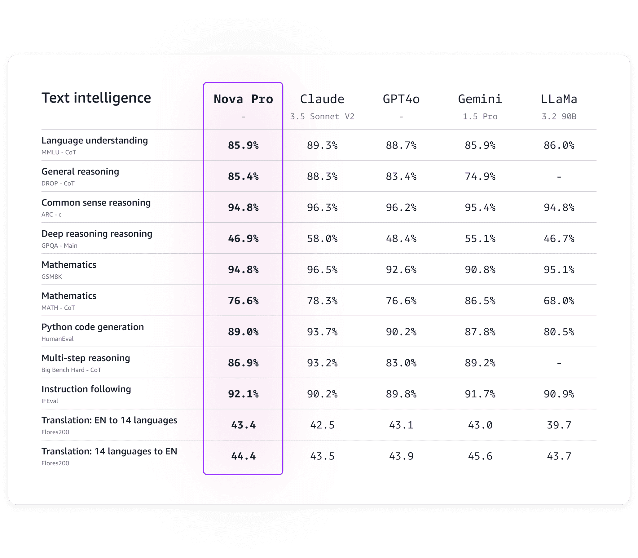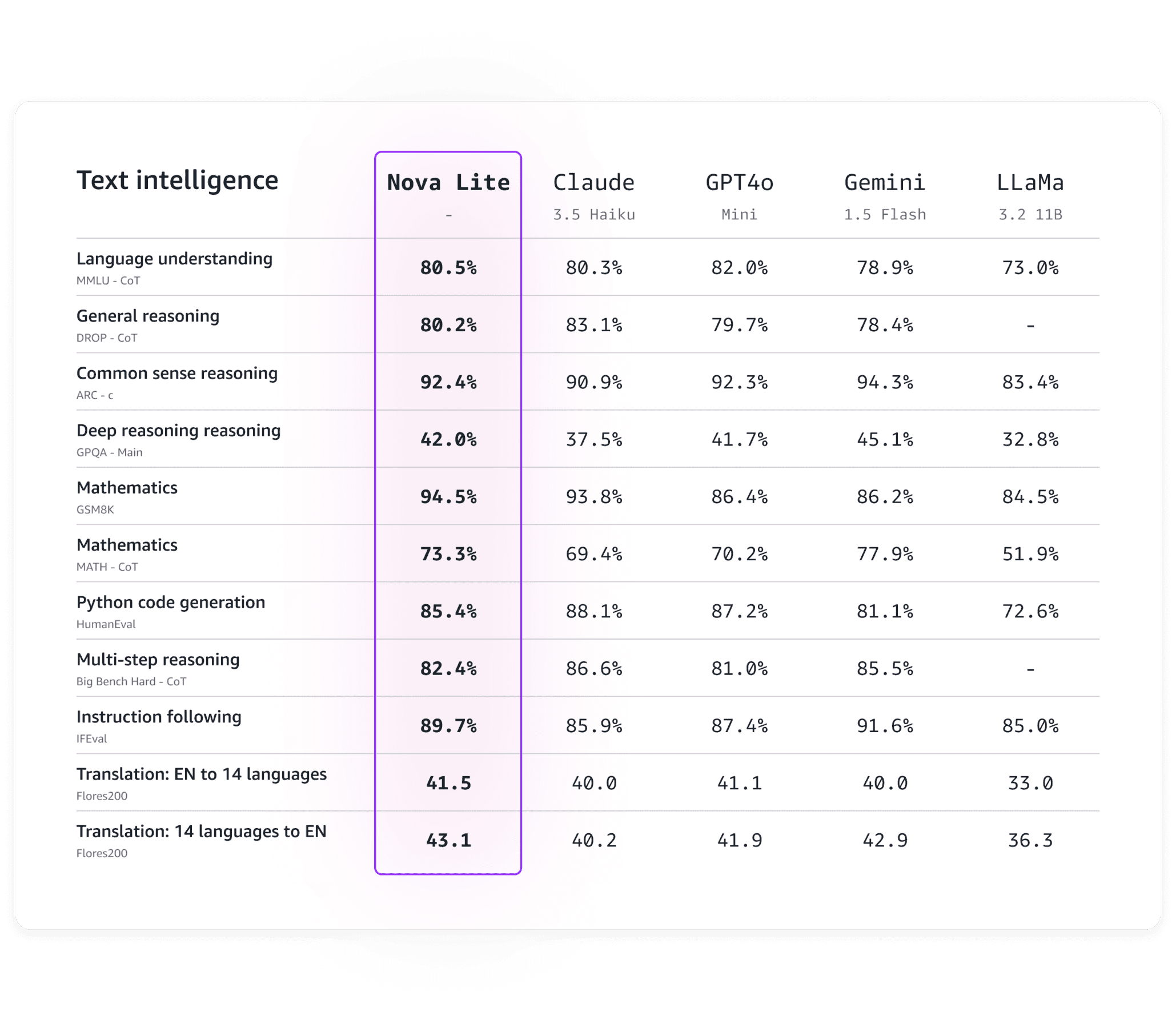 Nova Lite及びNova ProもAmazonによるベンチマークテストの結果、ビジュアル テストとエージェント ベース テストで競合システムと同様のパフォーマンスを発揮することが示されている。