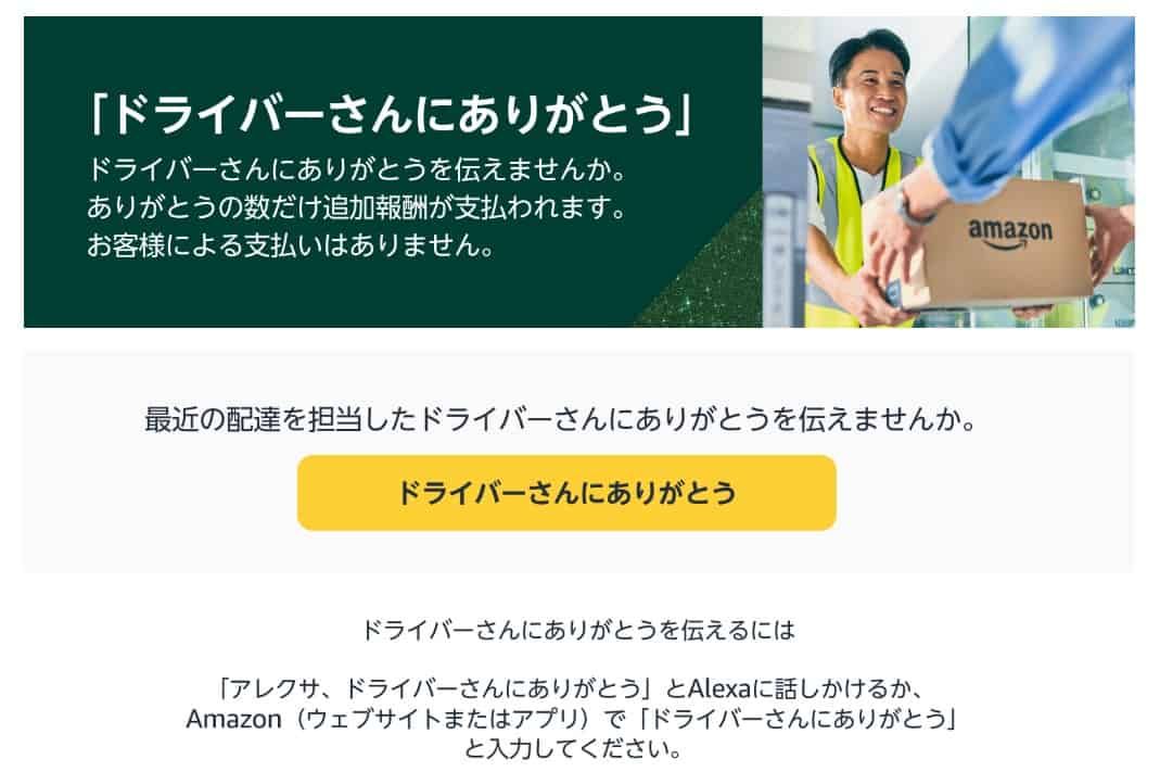 Amazonは11月29日、配送ドライバーへの感謝の気持ちを金銭的に還元する「ドライバーさんにありがとうキャンペーン」を日本で開始した。利用者がAlexaやアプリを通じて感謝を伝えると、1回につき500円がAmazonから配送パートナーに支払われる仕組みで、米国以外では日本が初の展開となる。