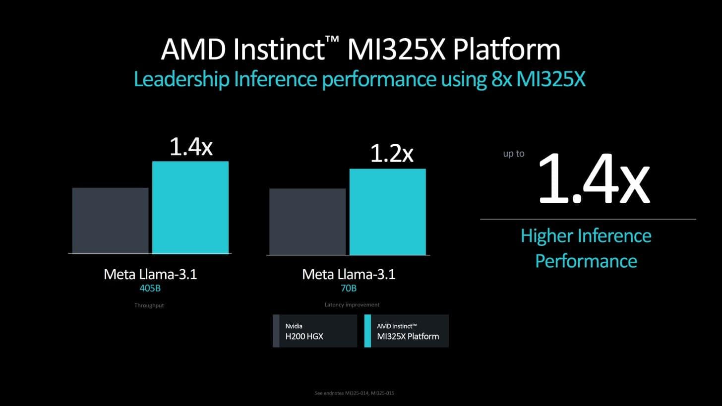 さらに、8基のMI325Xを搭載したプラットフォームでは、Llama 3.1 405Bモデルで40%、70Bモデルの推論テストで20%の性能優位性があるとしている。