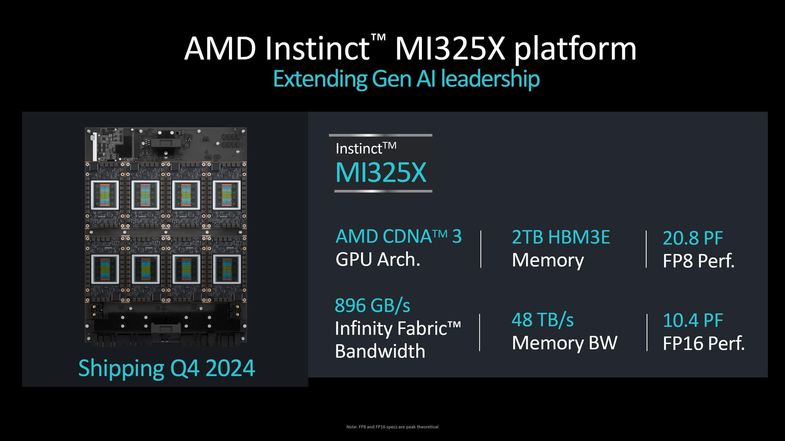 AMDのGPUプラットフォーム部門バイスプレジデントであるBrad McCredie氏は、「MI325Xは、AI推論と学習ワークロードにおいて、MI300Xの2倍以上の性能を発揮します」と述べている。