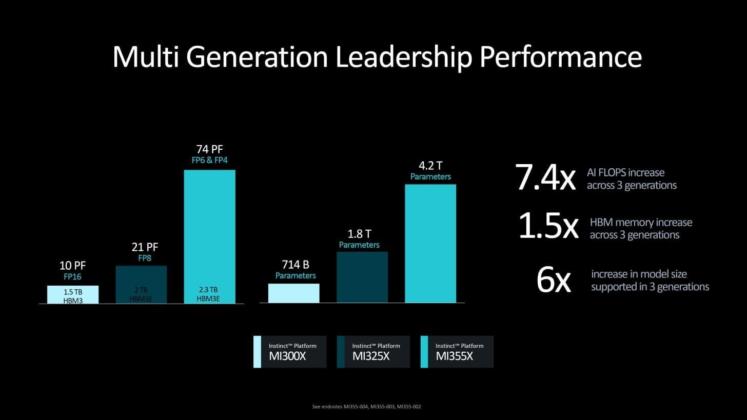 AMDは、MI355Xが前世代のMI325Xと比較して、以下のような性能向上を実現すると予告している: