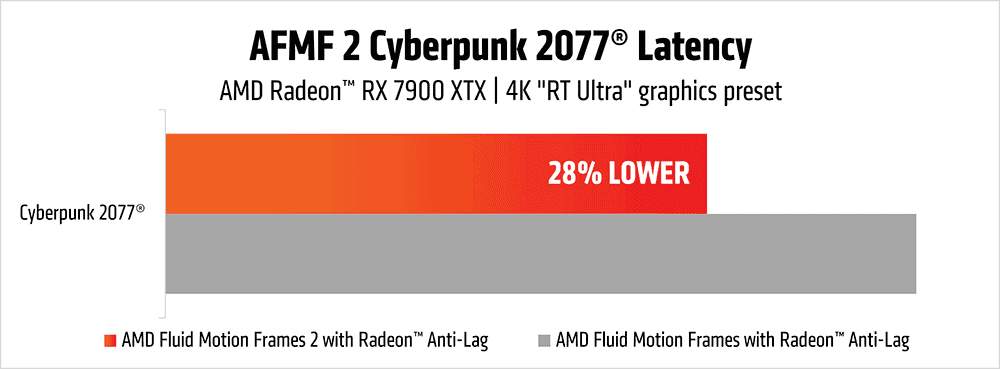 AFMF 2の最も注目すべき特徴は、大幅な遅延低減だ。AMDの実験によると、前バージョンと比較して最大28%の遅延低減を実現しているという。具体的には、Radeon RX 7900 XTXを搭載したシステムで『Cyberpunk 2077』を4K レイトレーシング ウルトラで動作させた場合、28%の遅延低減が確認された。さらに、Ryzen 7 8700GのRadeon 780M統合グラフィックスを使用した場合、『Counter-Strike 2』で最大12%の遅延低減が報告されている。これらの改善により、特に高解像度や高負荷のゲーミング環境において、よりレスポンシブな体験が可能となる。