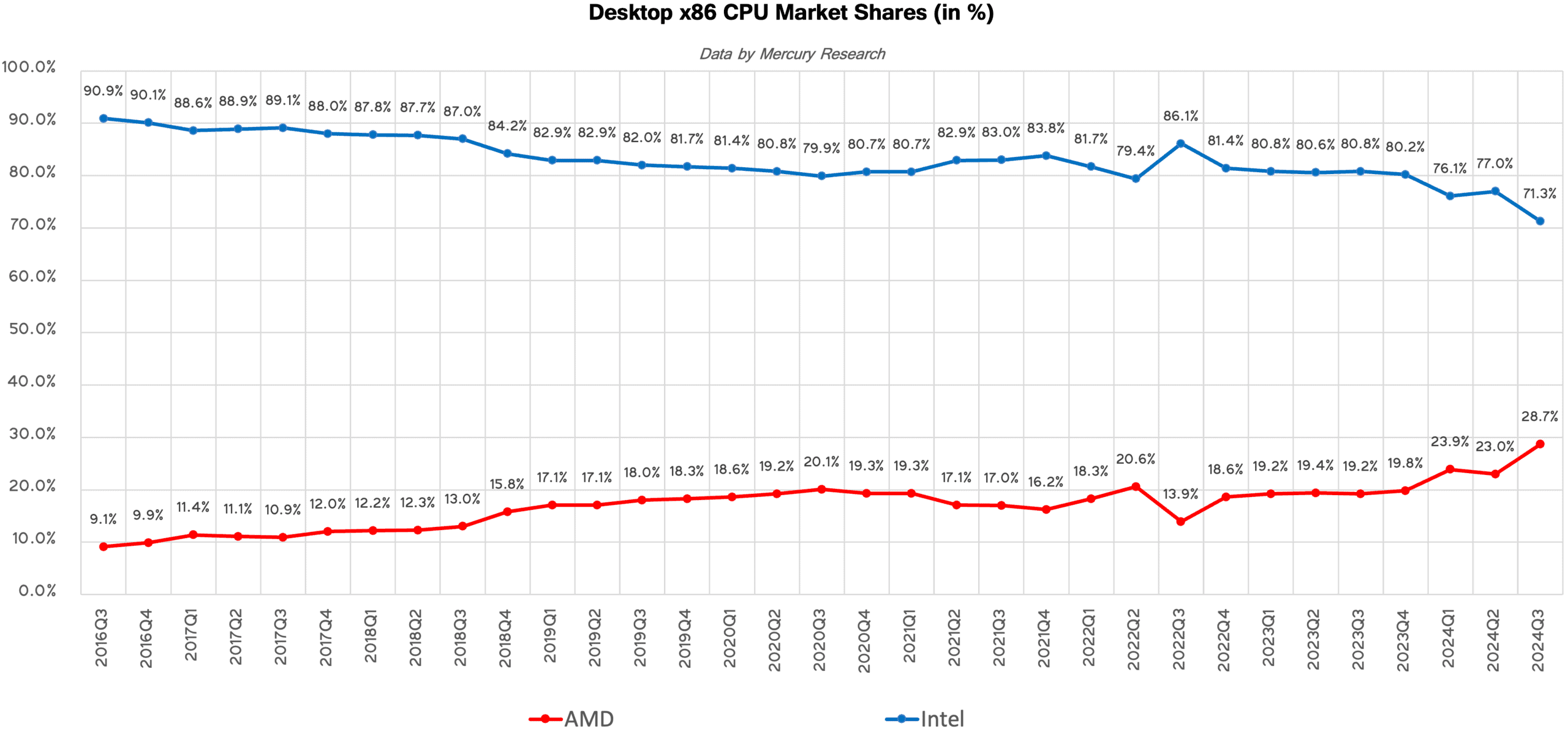 2024年第3四半期、AMDはデスクトップCPU市場でシェア28.7%に急成長を遂げ、モバイルCPUやサーバー分野でも着実に収益を拡大している。この急伸はIntelを筆頭とする競合他社への対抗力を強化し、今後の市場シェア争いにおいて重要な転換点となるかも知れない。