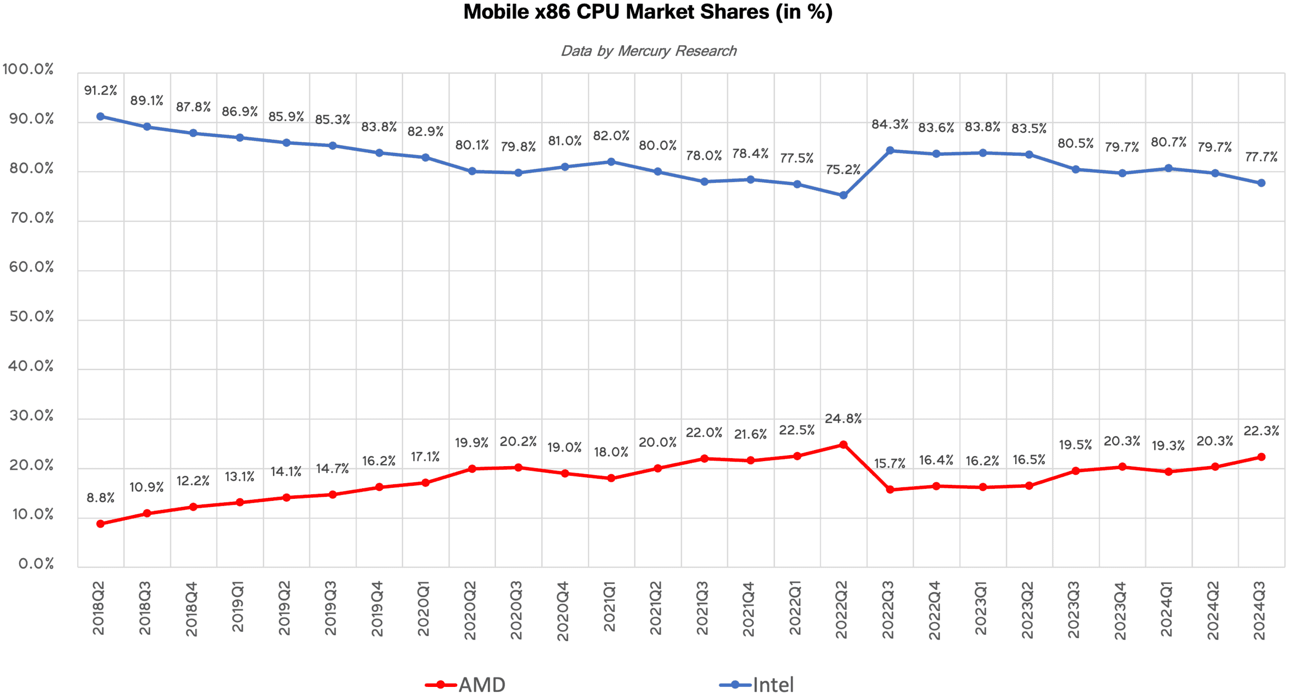 また、AMDのモバイルCPUが支持を集める背景には、コストパフォーマンスの高さがある。これまでIntelの独壇場だったノートPC市場でも、消費者が求める性能と価格のバランスにおいてRyzenが強みを発揮している。加えて、低消費電力であることから、熱処理に適した薄型・軽量ノートPCの製造が容易であり、これがバッテリー持続時間を求めるユーザー層からの評価を高めている要因である。こうした点が評価され、AMDはモバイル市場でのシェアを徐々に拡大しつつあり、今後もその成長が続く見通しだ。