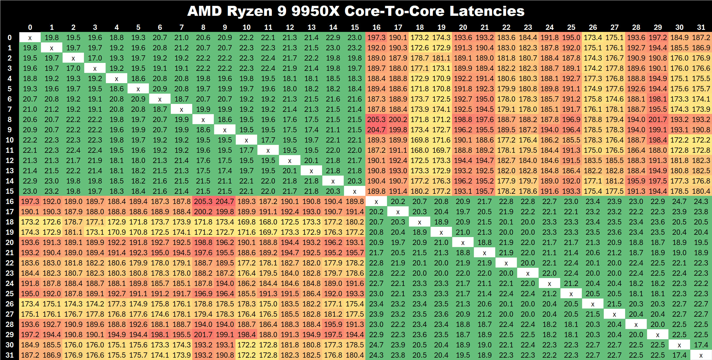 Anandtechの分析によると、Ryzen 9 9950XのCCD間レイテンシは約180ナノ秒と、前世代のRyzen 9 7950Xの76ナノ秒と比較して2倍以上の値を示していることが明らかになっている。この問題は、Windows環境だけでなくLinuxのハイパフォーマンスモードでも確認されているが、Ryzen 9 9950XがZen 4チップと同じI/OダイとInfinity Fabricを搭載しているため、この性能低下の原因は、ソフトウェアの不具合に原因があると見るのが妥当だろう。