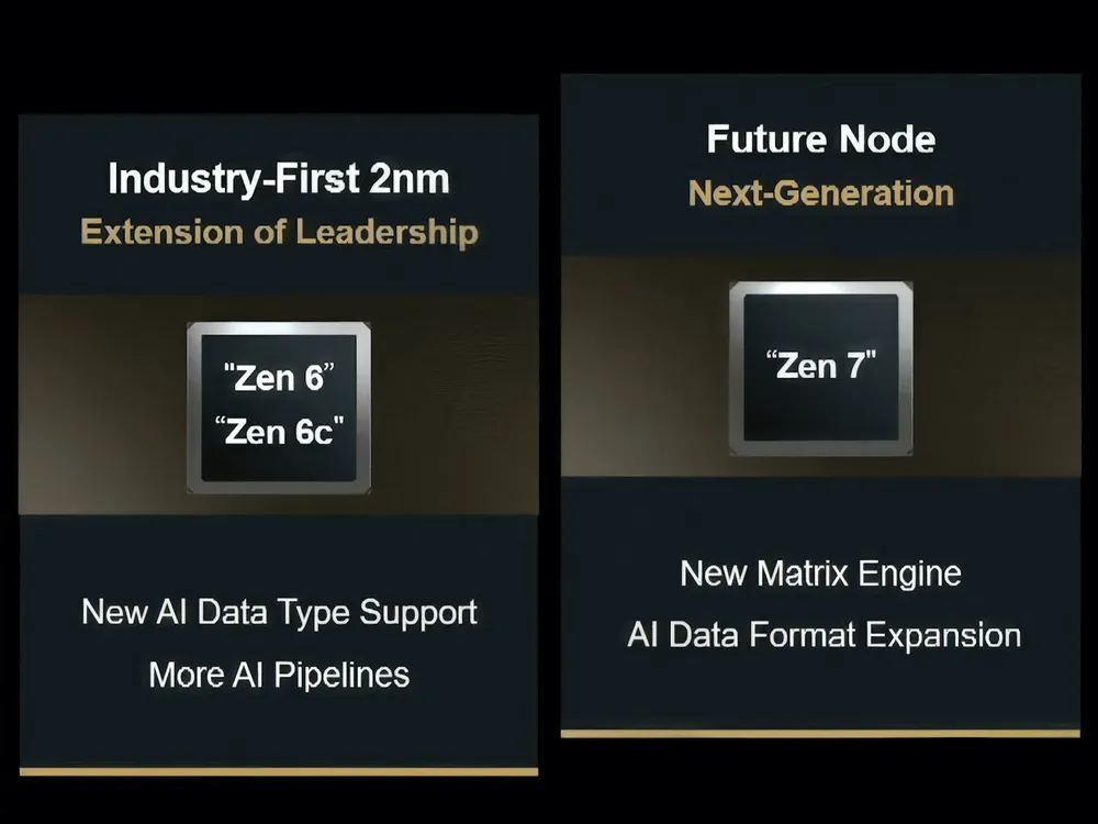 AMDはFinancial Analyst Day 2025において、次世代CPUコアアーキテクチャ「Zen 6」および「Zen 7」に関する公式ロードマップを公開した。Zen 6ではTSMCの2nmプロセスノードへの移行とAI向け命令セットの拡充が明示され、Zen 7では新たに「マトリックスエンジン」の搭載が予告された。これは、汎用コンピューティング市場におけるAI処理能力の統合を加速させるAMDの明確な戦略を示すものだ。