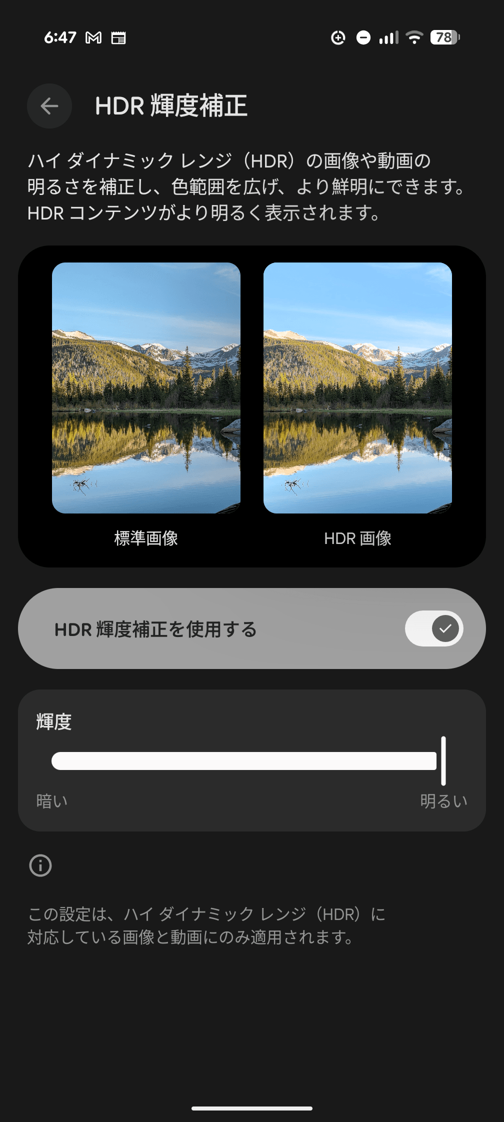 この設定画面では、HDRコンテンツが表示される際の輝度をスライダーで細かく調整できる。あるいは、HDRコンテンツ表示時に画面が明るくなること自体を無効にすることも可能だ。これは、ユーザーが自身の視聴環境や好みに合わせて、より快適なメディア体験を構築できるようにするための、きめ細やかな配慮と言える。