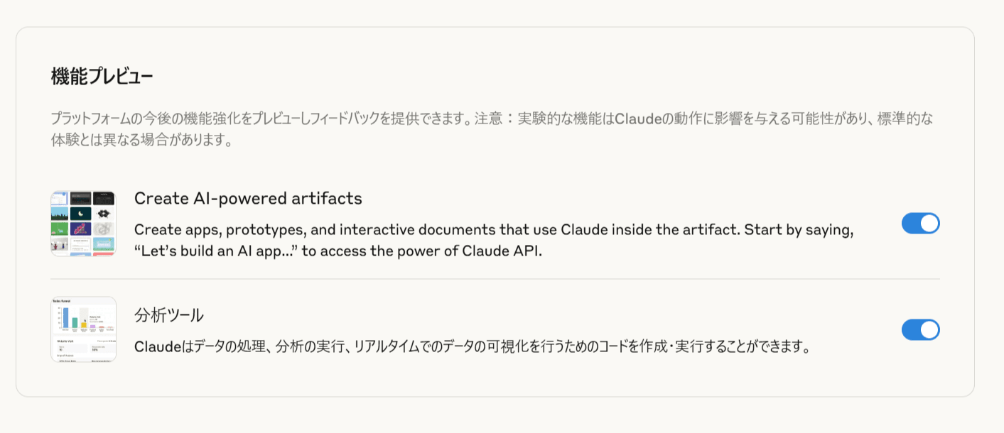 - 機能をオンにする: ページの下部にある「機能プレビュー」セクションを見つけ、「Create AI-powered artifacts(AI駆動のArtifactsを作成する)」という項目のスイッチをオンにする。
