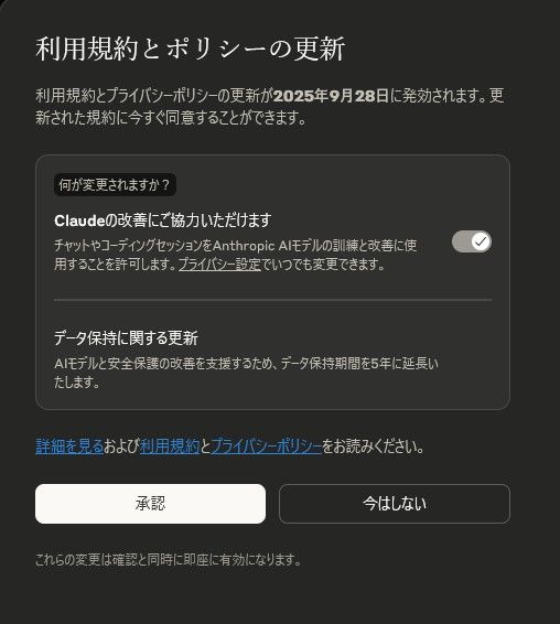 - 期限: 既存ユーザーは2025年9月28日までに、データ利用を許可するか否かの選択を迫られる。この日を過ぎると、選択を行うまでClaudeの利用が継続できなくなる可能性がある。