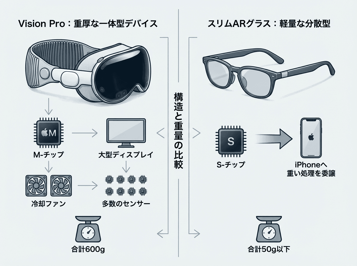 企業向けの医療現場やパイロット訓練ではニッチな需要が続くものの、Appleが次に開発するARグラスの設計思想はVision Proから大きく舵を切っている。アナリストMing-Chi Kuoや複数のメディアによれば、新製品にはiPhone向けのA-SeriesやVision Pro向けのM-Seriesではなく、Apple Watch向けのS-Seriesをベースにしたカスタムチップが搭載される。消費電力と発熱を大幅に抑えることで冷却機構を省き、通常の眼鏡に近い重量を実現する狙いだ。プロトタイプの重量は50g以下とも報じられているが、独立した確認は取れていない。