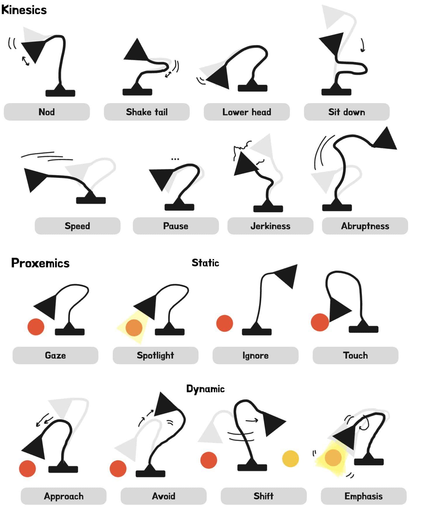 Appleの研究チームは、このルクソーJr.のように、非人間型のロボットでも動きを通じて豊かな表現力を持ち得ることを示唆する。ELEGNTのデザインは、ランプのシェード部分を「頭」、アーム部分を「首」に見立てることで、人間らしさを感じさせる工夫が施されている。