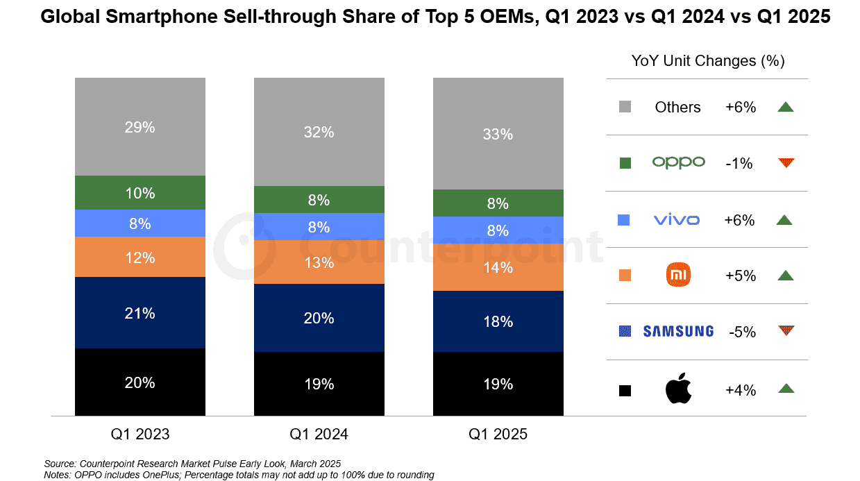 主要メーカーの2025年Q1世界スマートフォン市場シェア(Counterpoint Research調べ)