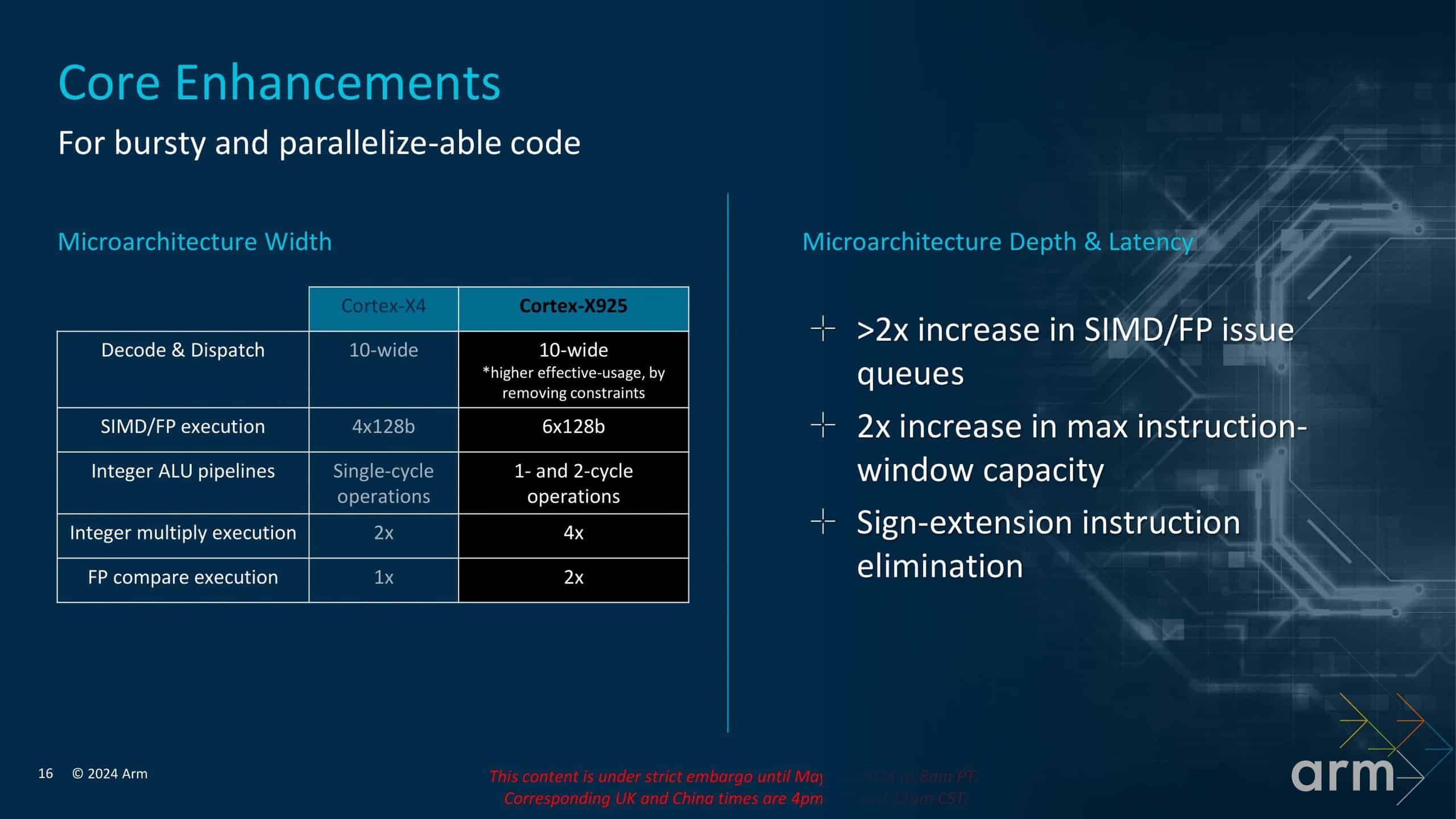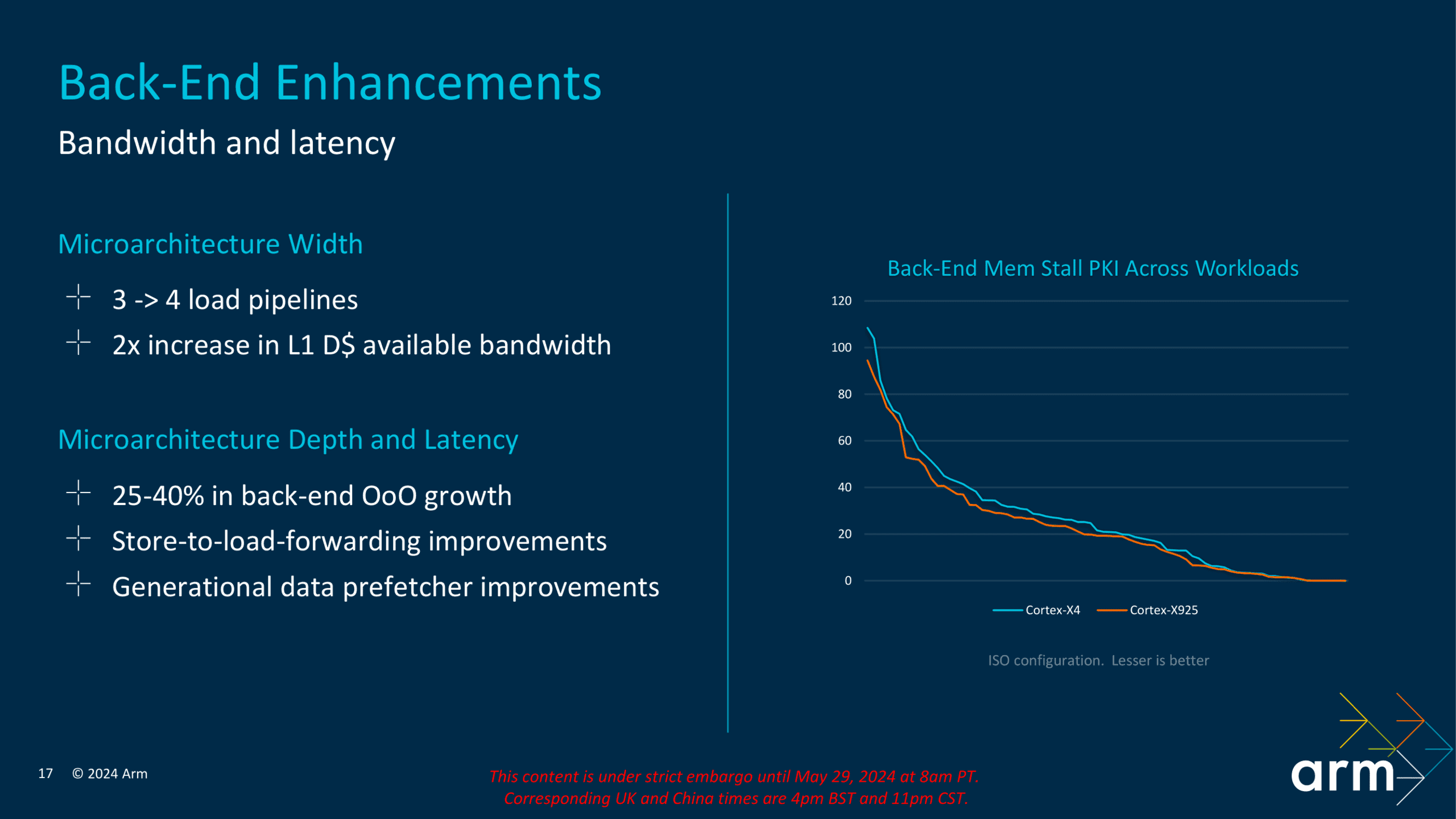 Cortex-X925のアウトオブオーダーウィンドウは非常に大きく、前世代の2倍である。つまり、Cortex-X925は768のフライト中の命令(または1,536の融合操作)のブックキーピング容量を持っている。Armによると、コアパイプラインの幅はほぼ同じであるが、X925は前世代の制約の除去により、より高い有効利用率を示すという。言い換えれば、理論上のピーク命令ストリームのスループットはX4と同じであるが、パイプラインのアーキテクチャ変更により、新しいX925の実際のピーク命令ストリームは高くなるとされている。