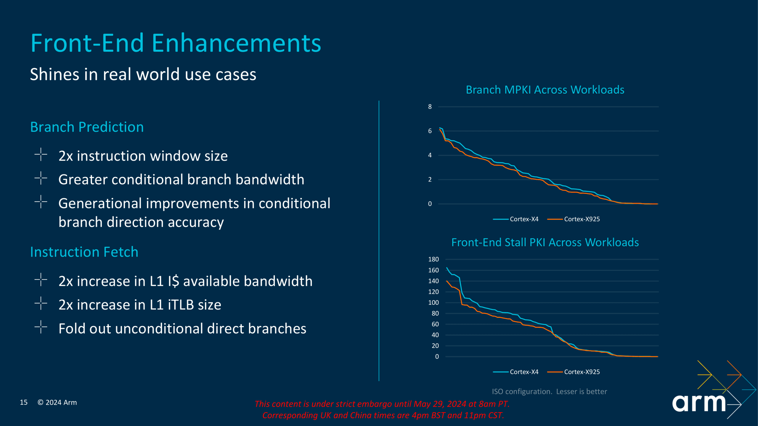 新しいCortex-X925の改良の大部分は、メモリ(直接および間接的に)に関連している。以前の世代と同様に、Cortex-X925は、使用される前に正しい命令ストリームを見つけるために命令フェッチを超えて実行するランアヘッド分岐予測器を持っている。Cortex-X925では、分岐予測器の命令ウィンドウサイズを2倍にし、条件付き分岐の帯域幅を増加させている。また、精度の向上も世代ごとに見られる。ISO構成では、Cortex-X925はキロ命令あたりの予測ミス(MPKI)が低くなると言われている。