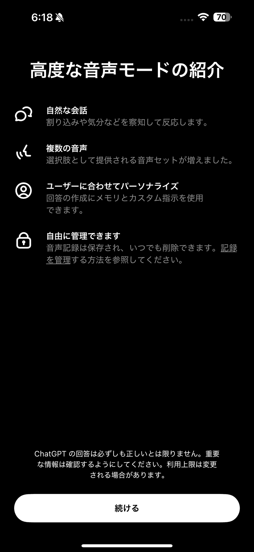 初めてChatGPTの高度な音声モードを利用した際には、以下の様な簡単な案内が表示される。ChatGPTの高度な音声モードではChatGPTの発言中に割り込んで会話ができたり、ユーザーの過去の発言などを記憶して、ユーザー毎にパーソナライズしてくれる機能が搭載されている。