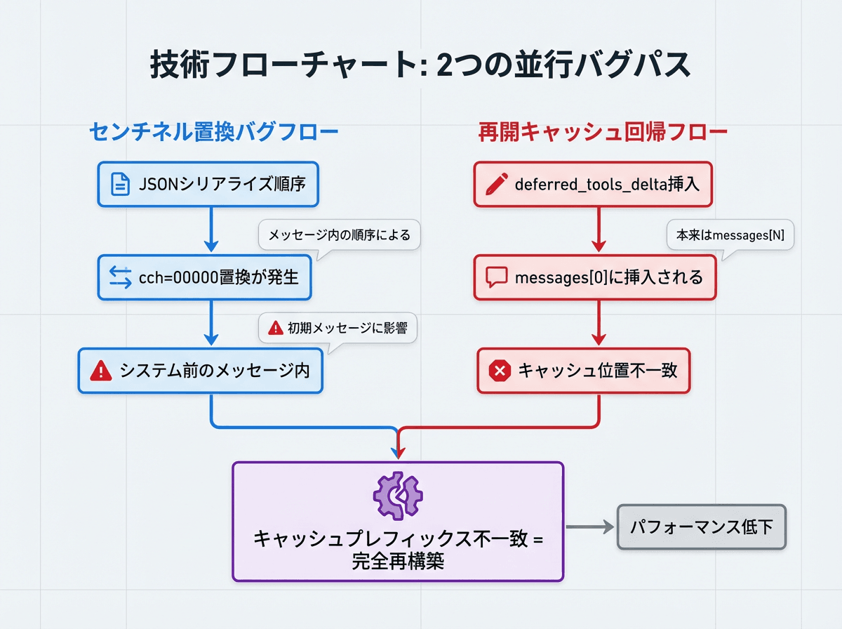 1つ目はsentinel replacementバグだ。Claude CodeのスタンドアロンバイナリはカスタムフォークされたBunランタイムで動作し、APIリクエストの送信直前にJSON本文中のcch=00000という課金用識別子を5桁のハッシュに置換する。通常はシステムプロンプト内の文字列が対象だが、JSONのシリアライズ順序上messages[]がsystem[]より前に来るため、会話履歴にこの文字列が含まれるとメッセージ側が先に書き換えられる。結果として毎回のリクエストでキャッシュのプレフィックスが変化し、キャッシュが全面的に無効化される。