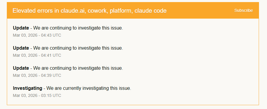 3月2日に発生した大規模なダウンタイムは、一過性のトラブルでは終わらなかった。Anthropicの公式ステータスページによれば、協定世界時(UTC)3月3日03時15分(日本時間12時15分)に新たな問題の調査が開始され、その後も解決に至っていない。筆者も実際に日本時間14時時点でもログインが不可能な状態を確認しており、ユーザーにはエラーメッセージが表示され続けている。