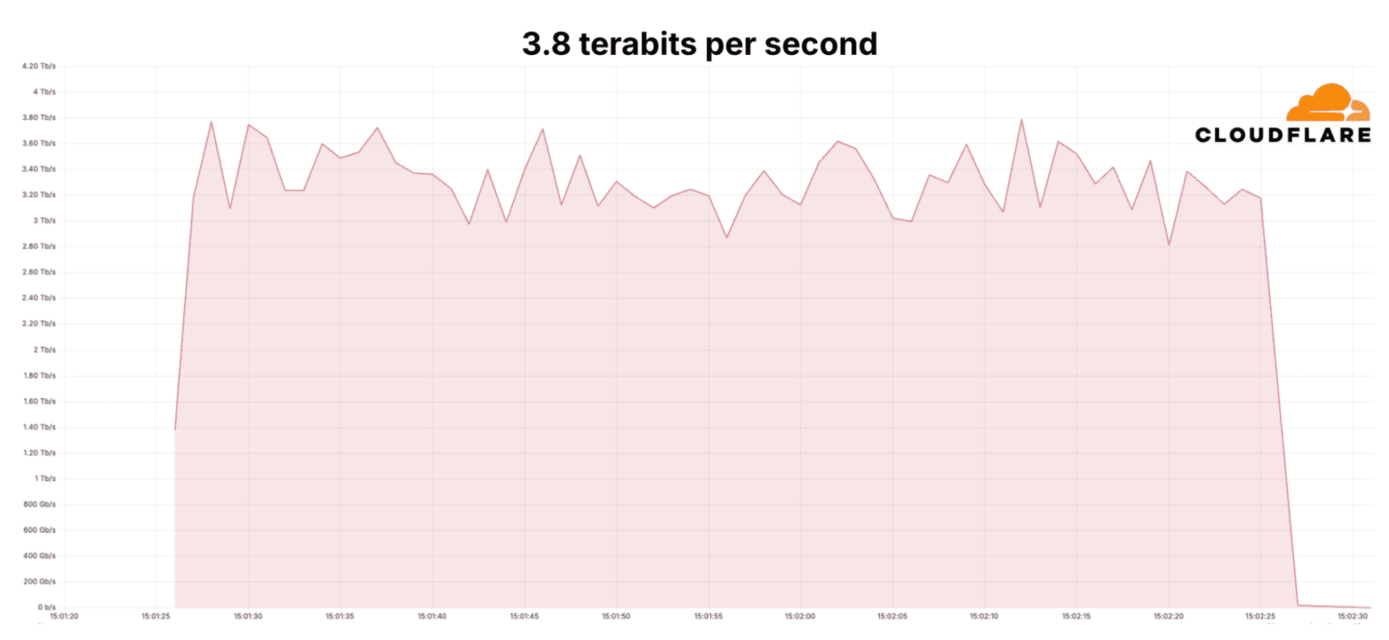 しかし、最も注目すべきは、単一の顧客を標的とした65秒間の攻撃で、トラフィックが3.8 Tbpsにまで達したことである。この数値は、公開されている中で史上最大のDDoS攻撃となり、以前Microsoftが防いだ3.47 Tbpsの記録を大きく上回るものであった。
