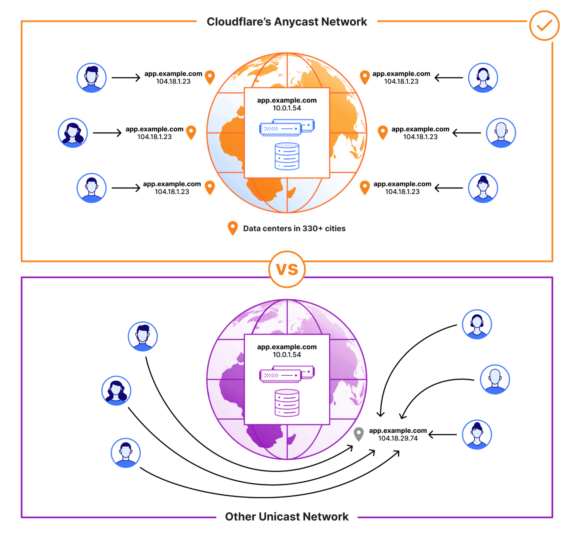 Cloudflareの防御システムのもう一つの重要な要素が、グローバルに展開されたAnycastネットワークである。Anycastでは、単一のIPアドレスを世界中の複数のマシンで広告することができる。これにより、攻撃トラフィックは地理的に最も近いCloudflareのサーバーに自動的に振り分けられる。