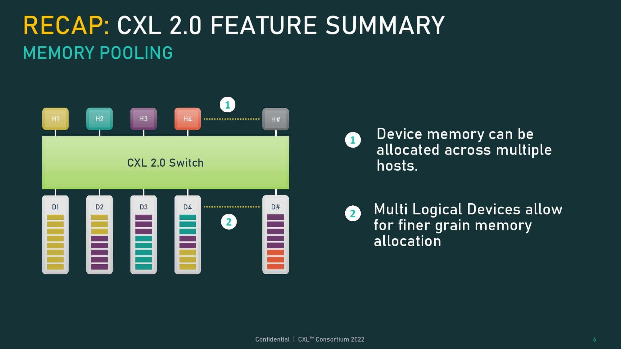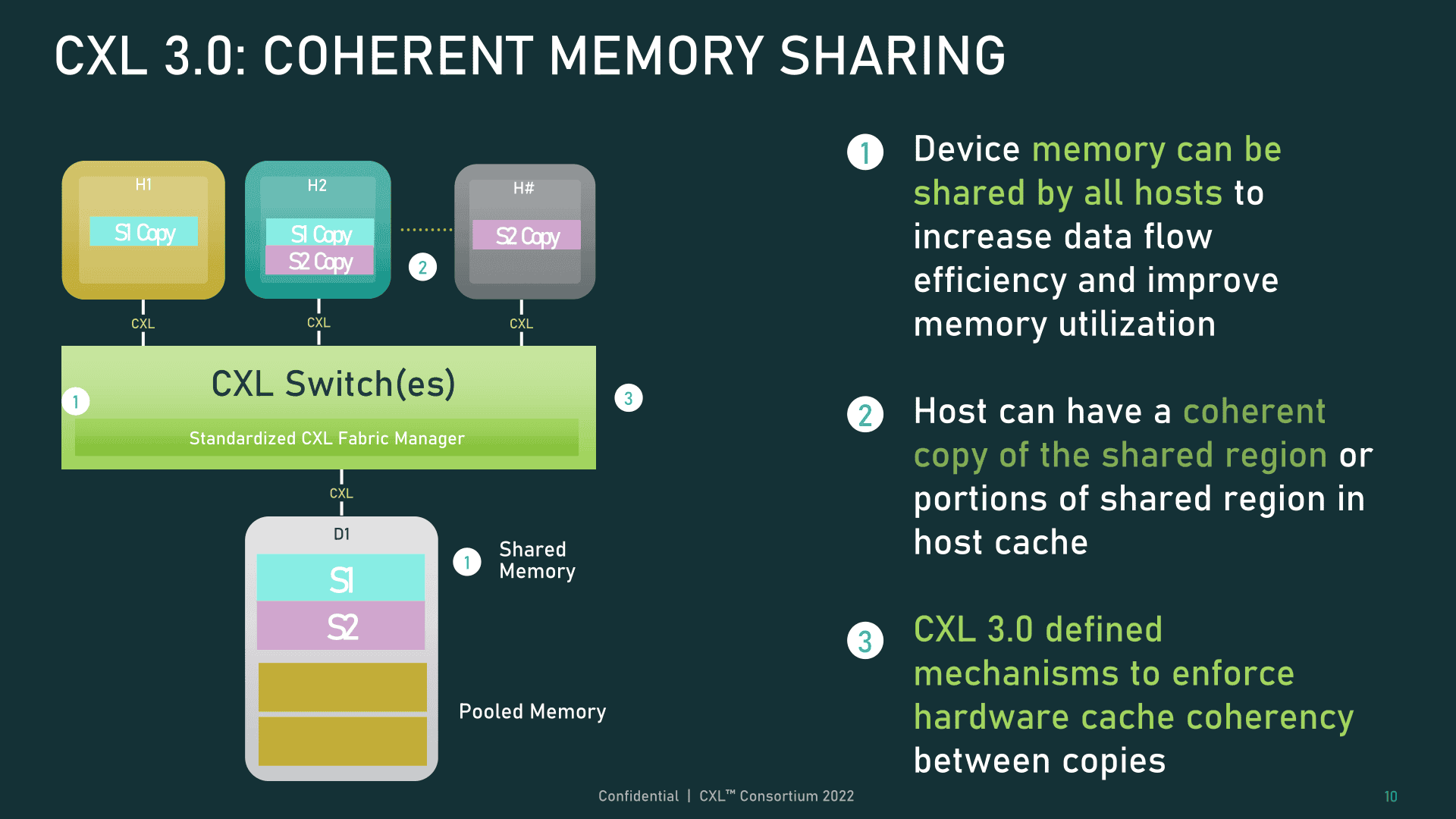 CXL 2.0仕様では、メモリ領域を異なるホストに動的に割り当てたり解除したりするメモリプーリングがサポートされており、1つのストレージデバイスを複数のセグメントに細分化することができたが、各領域は1つのホストにしか割り当てられなかった。CXL 3.0では、ハードウェアコヒーレンシによって複数のホスト間でデータ領域を共有できるメモリ共有が追加された。これは、各ホストが最新の情報を見ることができるように、ハードウェアキャッシュのコヒーレンシを追加したホストキャッシュにデータを配置することで機能する。