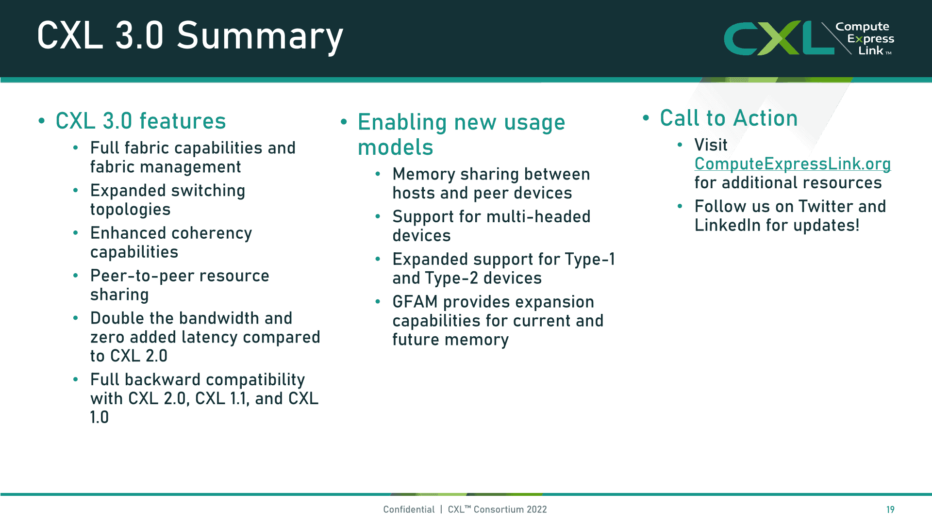 Compute Express Link(CXL)コンソーシアムは、CXL 3.0仕様を発表し、PCIe 6.0インターフェースのサポート、メモリプーリング、更に複雑なスイッチングおよびファブリック機能への対応といった、数々の新機能を実現した。CXL 3.0では、旧バージョンの仕様との後方互換性を維持しながら、最大2倍の帯域幅をサポートすることが可能になることが最大の特徴だろう。