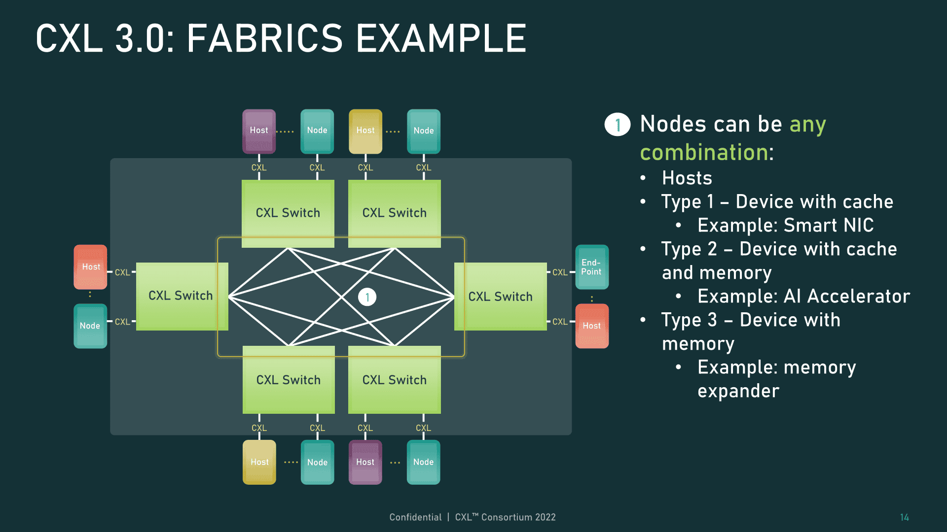 CXL 仕様では、デバイスを異なるクラスに分類している。タイプ1デバイスはローカルメモリを持たないアクセラレータ、タイプ2デバイスは独自のメモリを持つアクセラレータ(GPU、FPGA、DDRやHBMを持つASICなど)、タイプ3デバイスはメモリデバイスで構成されている。さらに、CXL は、1 つのホストルートポートでこれらのタイプのデバイスの混在をサポートし、以下で説明するような複雑なトポロジのオプションを大幅に拡張している。