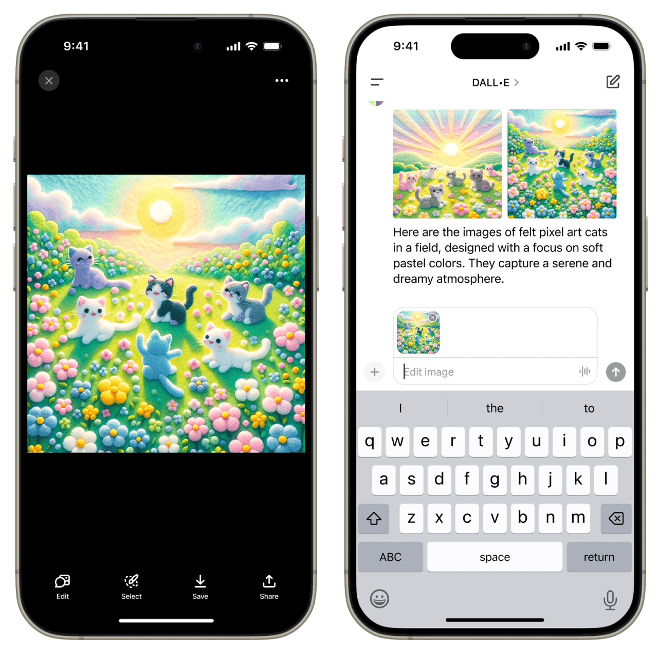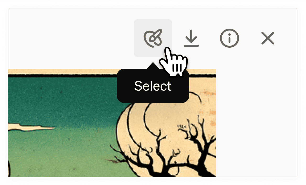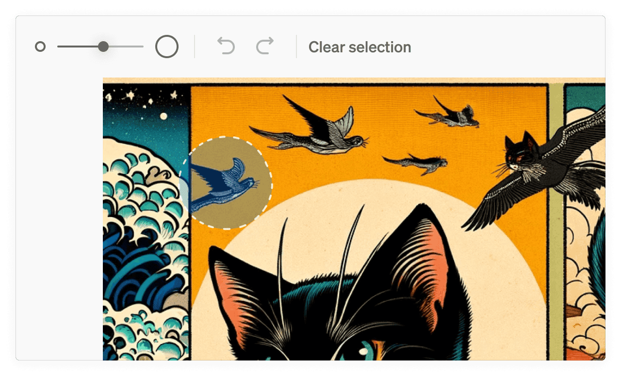 画像編集はChatGPTアプリでも同様に機能する:画像を選択した後、ユーザーは指示を入力するか、「選択」オプションを使用して領域をマークすることが可能だ。スライダーは選択ツールのサイズを変更し、ボタンは操作を元に戻したりやり直したりするために使える。