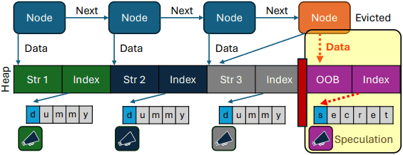 攻撃の実行過程では、まずLAPに特定のアクセスパターンを学習させる。この学習フェーズでは、メモリアドレスが一定のストライドで増加するようなアクセスを繰り返し行う。続いて、突然異なるメモリレイアウトに切り替えることで、LAPの予測を意図的に誤らせる。プロセッサはこの誤った予測に基づいて投機的実行を行い、本来アクセスすべきでないメモリ領域の内容を読み取ってしまう。