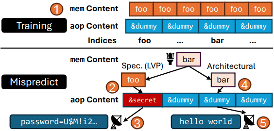 攻撃者はこの挙動を悪用し、以下のような過程で機密データにアクセスすることが可能となる。まず、特定のメモリ位置から一定の値が読み込まれるように設定し、LVPにその値を「学習」させる。研究チームによると、信頼性の高い予測を引き起こすには約250回の学習用読み込みが必要とされる。次に、そのメモリ位置の実際の値を別の値に変更する。このとき、LVPは以前学習した古い値を予測値として使用してしまう。