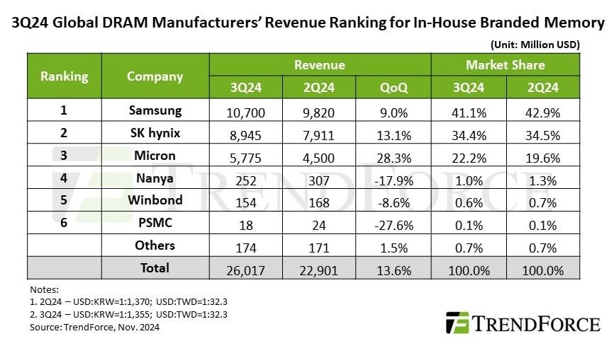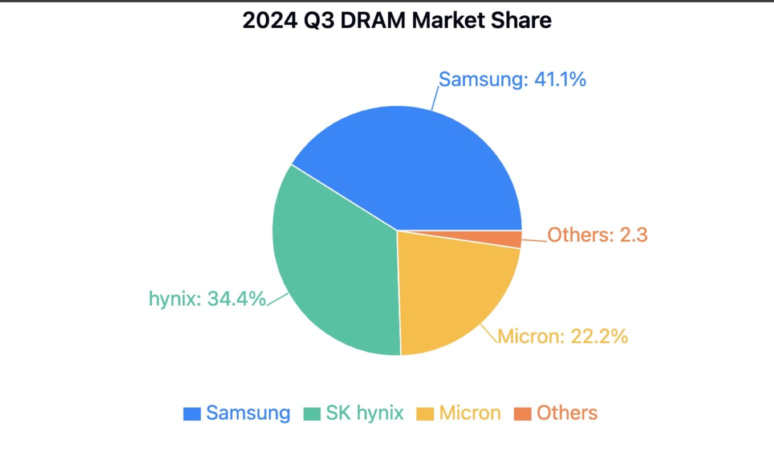 2024年第3四半期のDRAM市場で、トップ3メーカーはそれぞれ特徴的な成長を遂げた。首位のSamsung Electronicsは、売上高107億ドルを記録し、41.1%の市場シェアを確保した。これは前四半期比で9%の成長となる。特筆すべきは、同社が採用した戦略的なアプローチで、LPDDR4およびDDR4の在庫を慎重に調整しながら、出荷量を前四半期と同水準に維持することに成功した。しかしながら、市場シェアでは前四半期から1.8ポイントの減少となっており、競合他社の急成長が影響している。