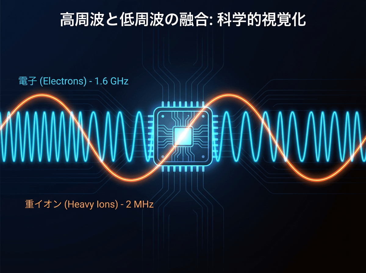 ここに決定的な物理の難問が生じる。陽電子と反陽子は、電荷の符号こそ逆であるが、その質量比は約1,836倍にも達する。質量の軽い陽電子を安定して閉じ込めるためには、ギガヘルツ(GHz)帯域に達する極めて高速な振動電場が不可欠である。一方、質量の重い反陽子にとって、GHz帯の振動は速すぎる。波の頂点と谷が目まぐるしく入れ替わるため、重い粒子はそれに追従できず、時間平均すると力が打ち消し合ってゼロになってしまう。反陽子を引き留めるためには、メガヘルツ(MHz)帯のゆっくりとした電場振動が必要となる。