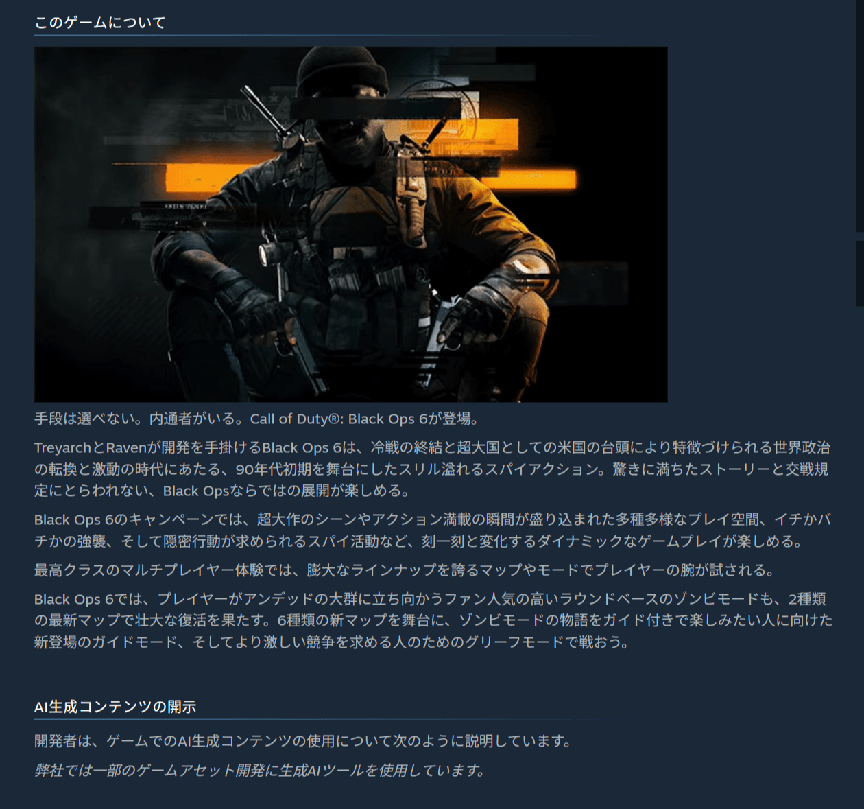 対照的に、PCゲーム市場の覇者であるValveは、2024年初頭にSteamにおける生成AIポリシーを正式に導入した。開発者はゲーム内でAIシステムがどのように使用されているかを開示する義務があり、ストアページには「AI生成コンテンツの開示(AI-generated content disclosure)」というセクションが設けられている。