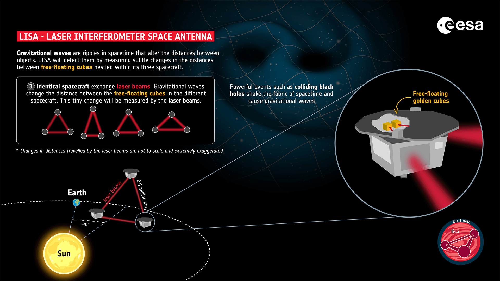 この前例のない編隊飛行の目的は、レーザー干渉計と呼ばれる仕組みを使って、重力波が通過する際に生じる宇宙機間のごく僅かな距離の変化を測定することにある。LISAが挑むのは、この250万kmという途方もない距離において、わずか数ピコメートル(1兆分の数メートル)、つまりヘリウム原子1個の直径にも満たない変化を検出するという、精密工学の極致とも言える挑戦だ。