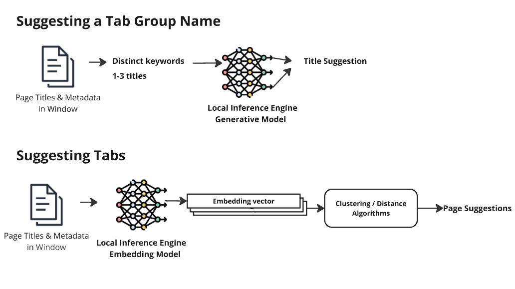- クラスタリングと名称提案: 次に、クラスタリングアルゴリズムがこれらのベクトルを比較し、数値的に「近い」ものを関連タブとして特定する。グループ名を提案する際には、Google AIが開発した言語モデル「T5」をベースにしたMozilla独自のモデルが、タブのタイトル群から最適な名前を生成する。